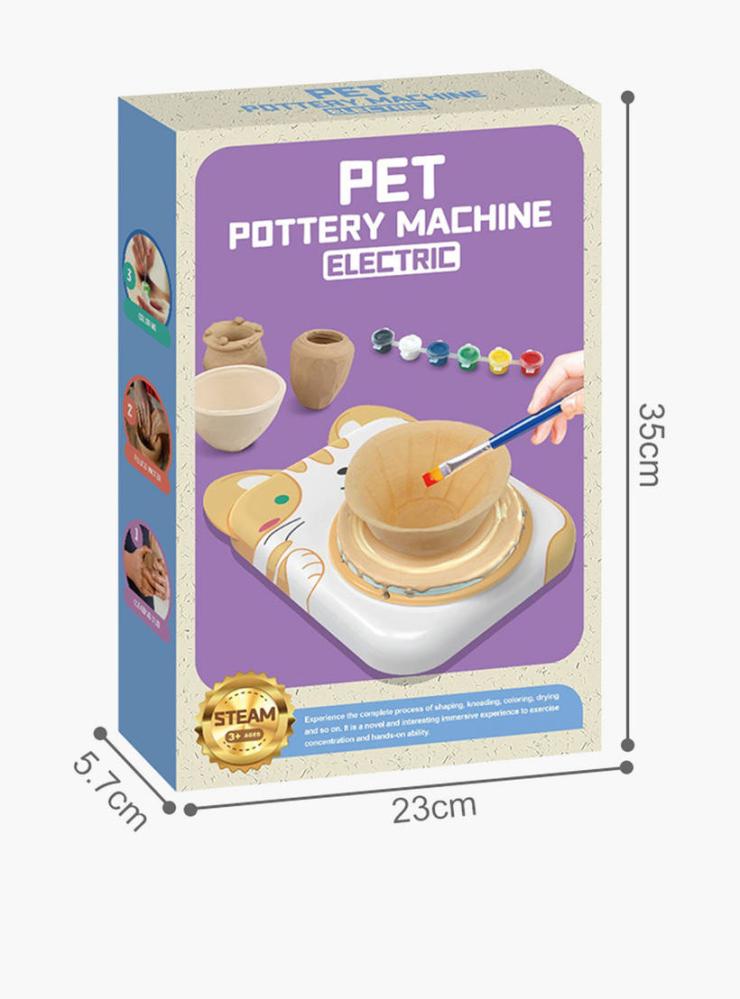 - المحتويات: عجلة فخار كهربائية صغيرة، طين خاص لصناعة الفخار، مجموعة أدوات تشكيل، وألوان مخصصة لتزيين الأعمال.